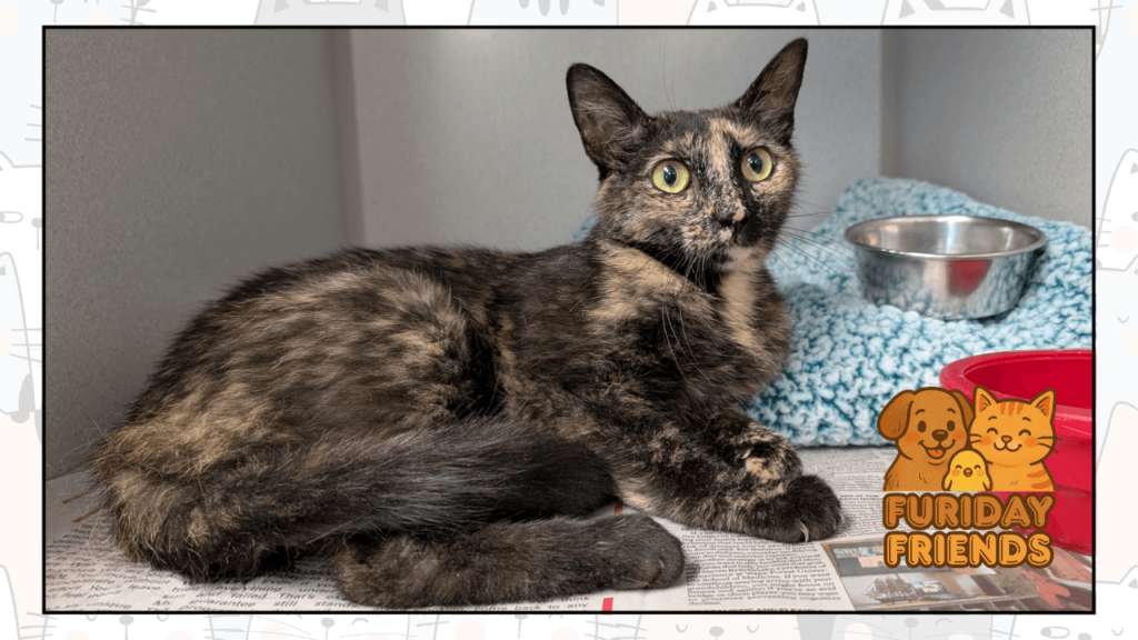 Spooky is an adorable tortie and she’s between 1-2 years old.