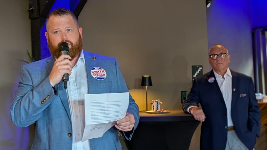 In his speech, Smith said he’s not going to make promises to voters which he can’t deliver but said he and Marsh have a plan, if elected, that could actually lower taxes. One way is to make City Hall more efficient. Smith addressed nepotism in City government.