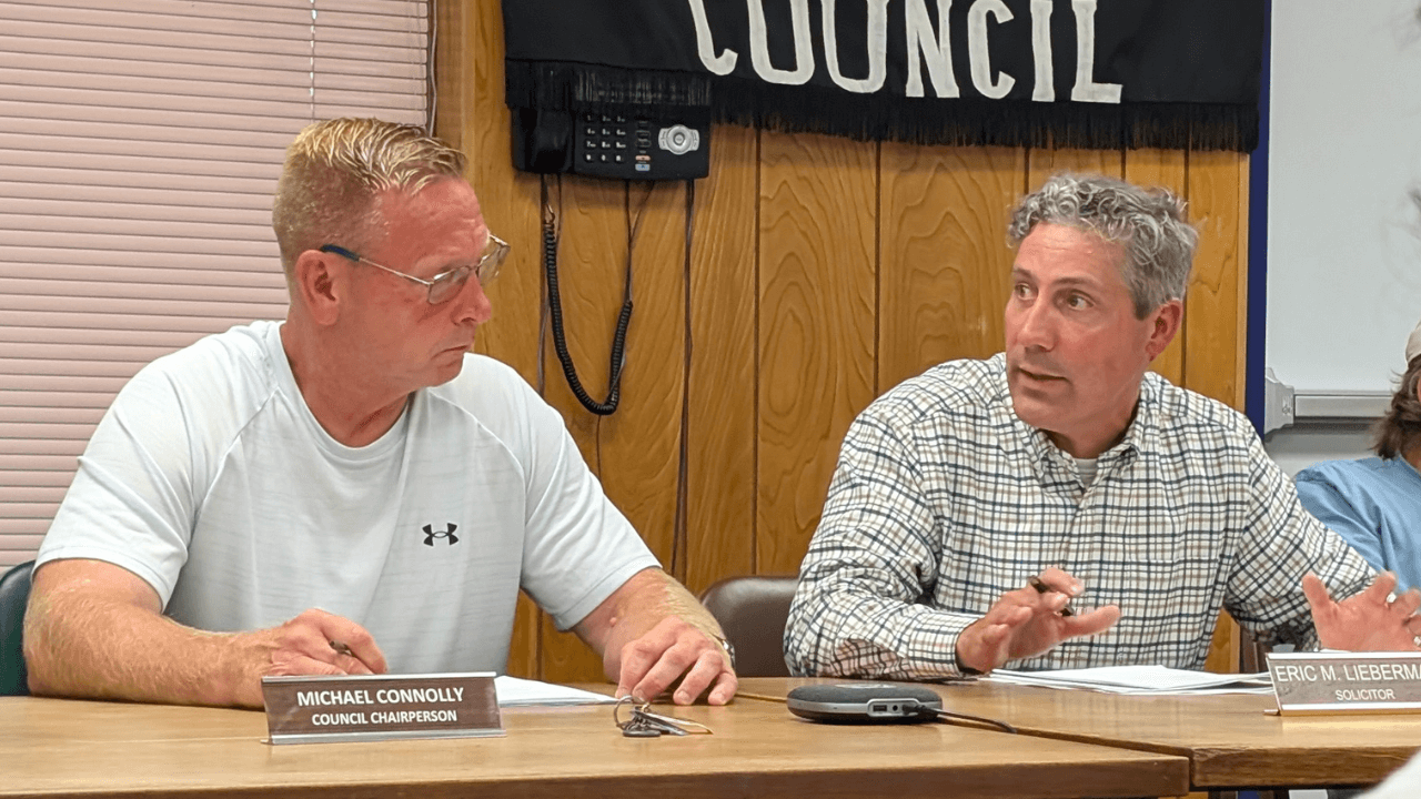 PHOTO: Mahanoy City Solicitor Eric Lieberman (right) tells council members, including Michael Connolly (left) his recommendation to allow public comments at workshop meetings in the future. (Coal Region Canary photo)