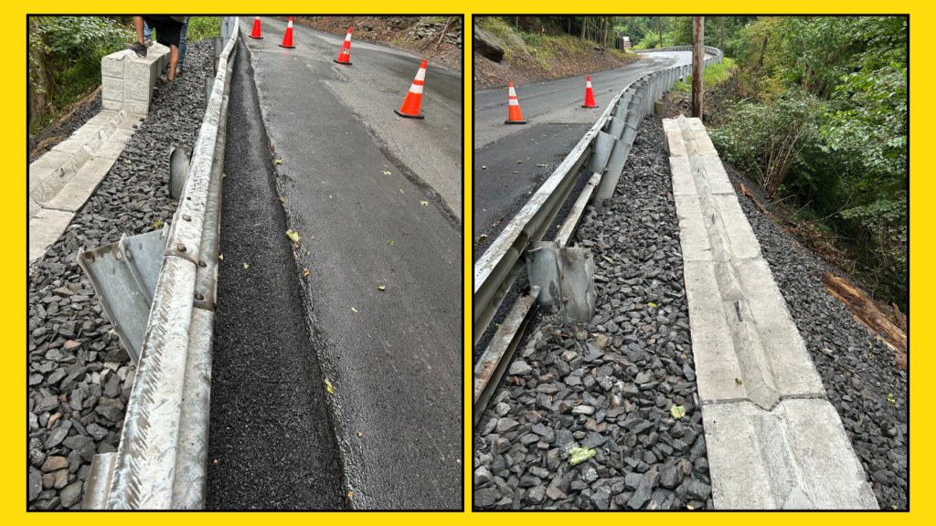 Large concrete blocks were used to rebuild a retaining wall that was failing to keep the winding mountainside road in place. Curbing was rebuilt in an attempt to prevent rushing water during heavy rainstorms from eroding the edge of the road.