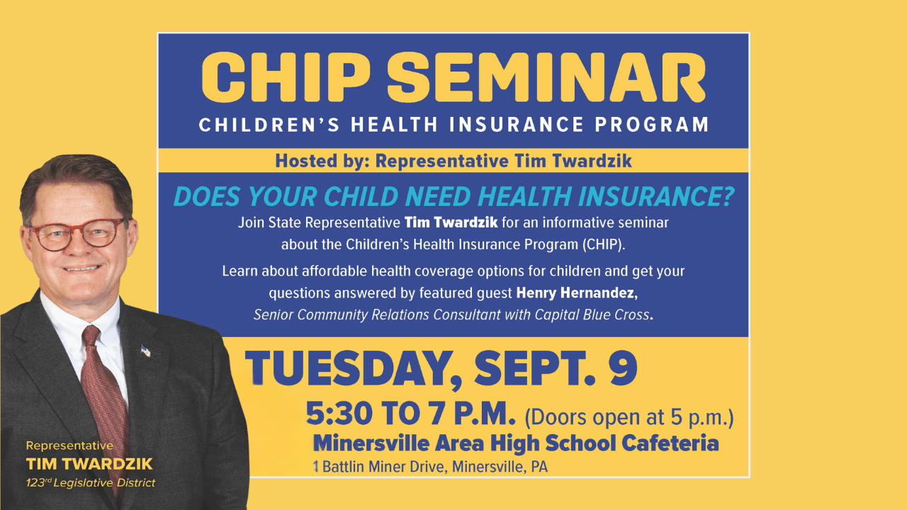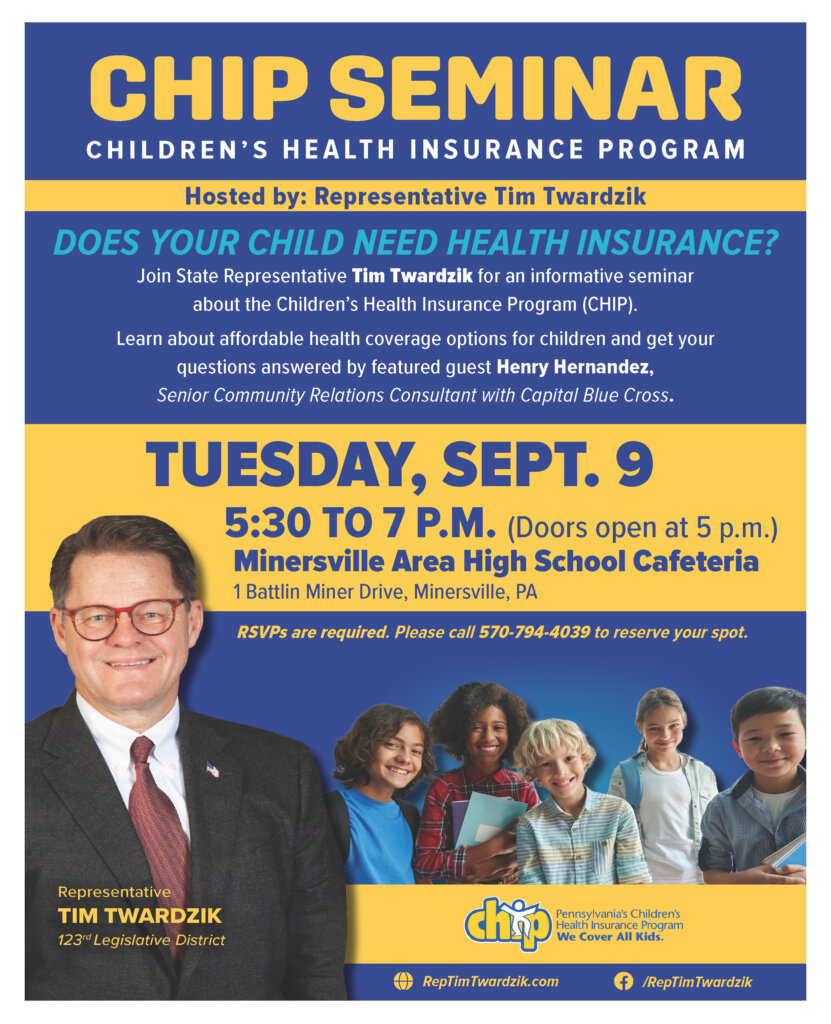 State Rep. Tim Twardzik will host an informational seminar on Pennsylvania’s Children’s Health Insurance Program (CHIP) on Tuesday, Sept. 9, from 5:30 to 7 p.m. in the Minersville Area High School cafeteria, 1 Battlin Miner Drive, Minersville.