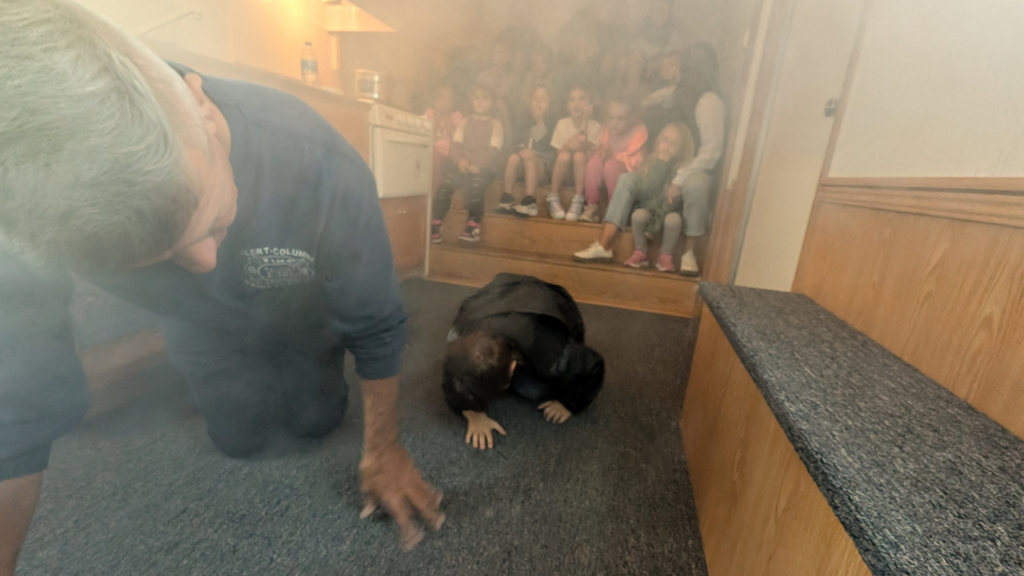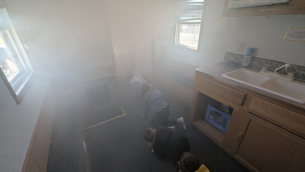 Uhrin showed students scenarios inside the Safety House that could lead to a fire. As he did that, the demonstration trailer began filling up with smoke (no, it wasn’t real smoke) and students learned how to get down on the floor and crawl to safety, where Uhrin was there to assist them down a ladder and outside the building.