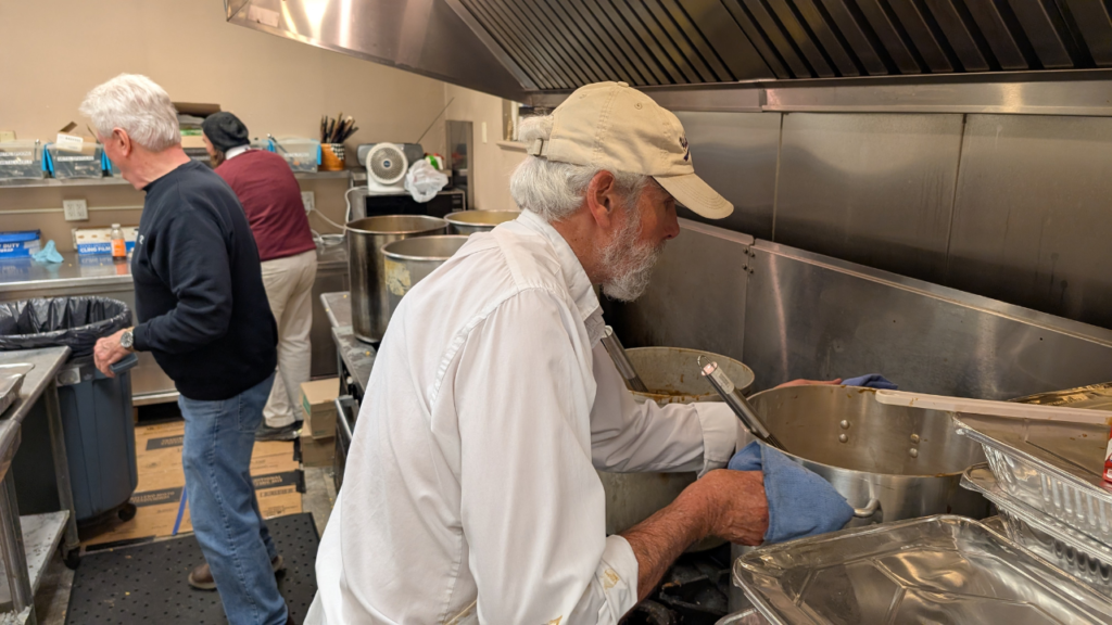 Back in the kitchen, Greg Wagner leads the cooking effort that starts the night before Thanksgiving and goes through the night.
