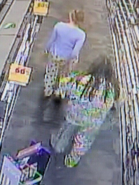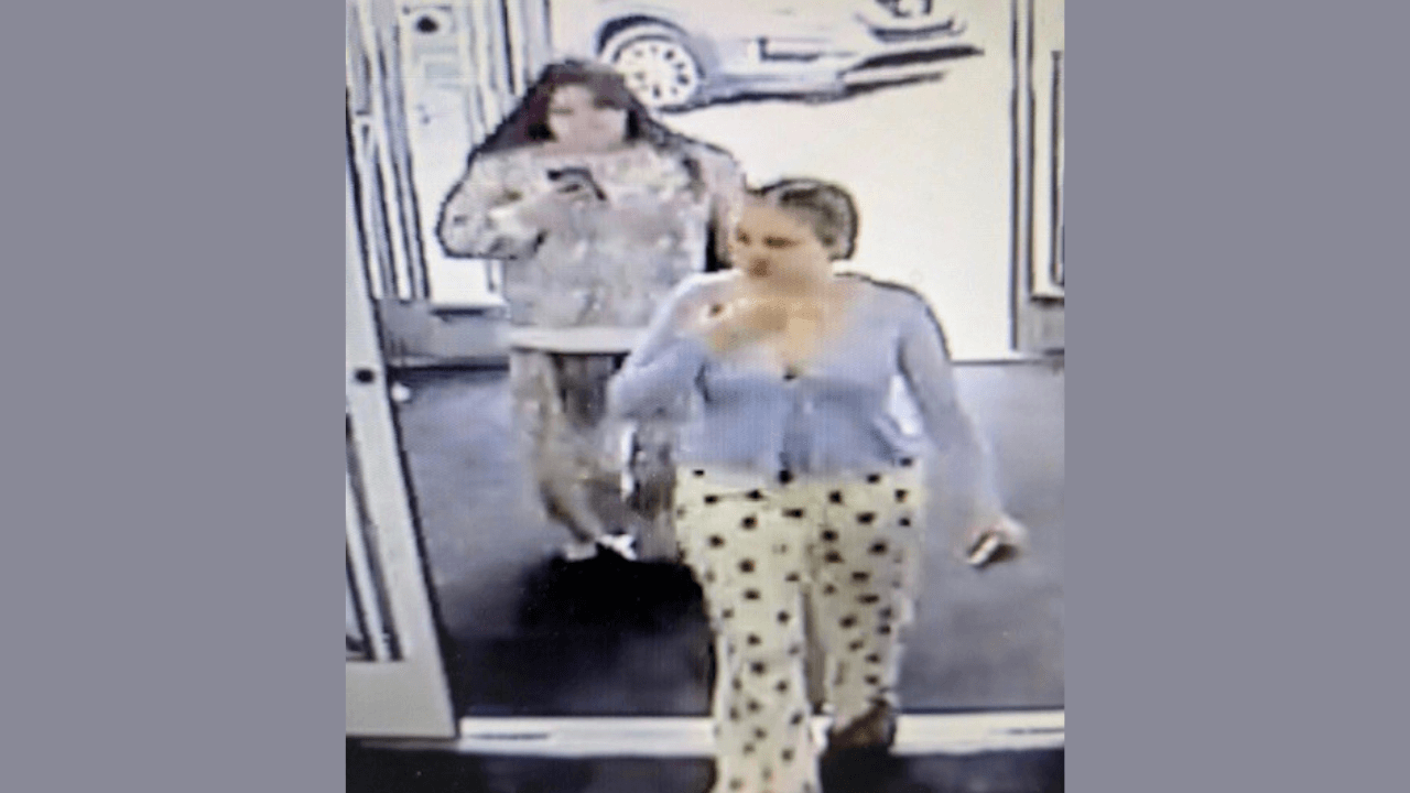 Police say, based on the surveillance images, that one dark-haired woman appeared to be wearing camo sweatpants and a sweatshirt while the other, a blonde, wore a blue top with pajama pants.