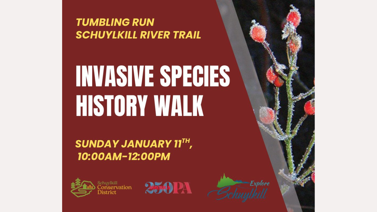 The Invasive Species History walk meets at the Tumbling Run Trail parking lot. Children and dogs that can handle long walks are welcome. Sunday’s walk is about 2-3 miles and is relatively easy. It’s sponsored by Explore Schuylkill.