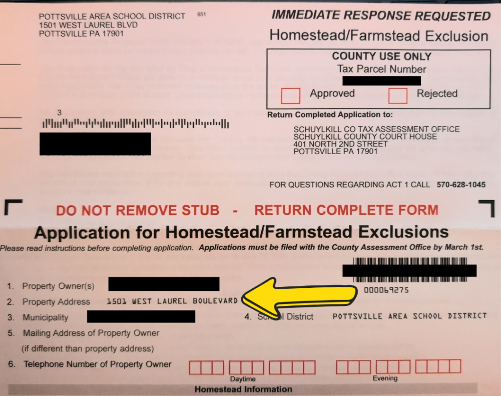 Once that new, corrected application is printed and mailed, property owners wishing to apply for the Homestead/Farmstead Exclusion should fill it out and send to the Tax Assessment Office at 401 N. 2nd St, Pottsville.