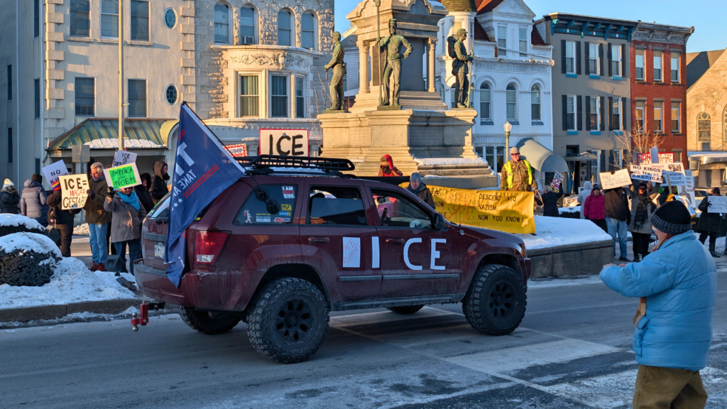 Some counter-protestors even drove around the square, taking to a loudspeaker to heckle the anti-ICE group in the monument park.