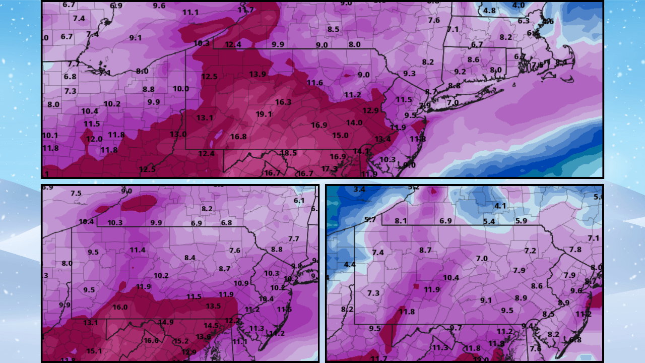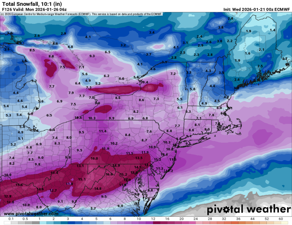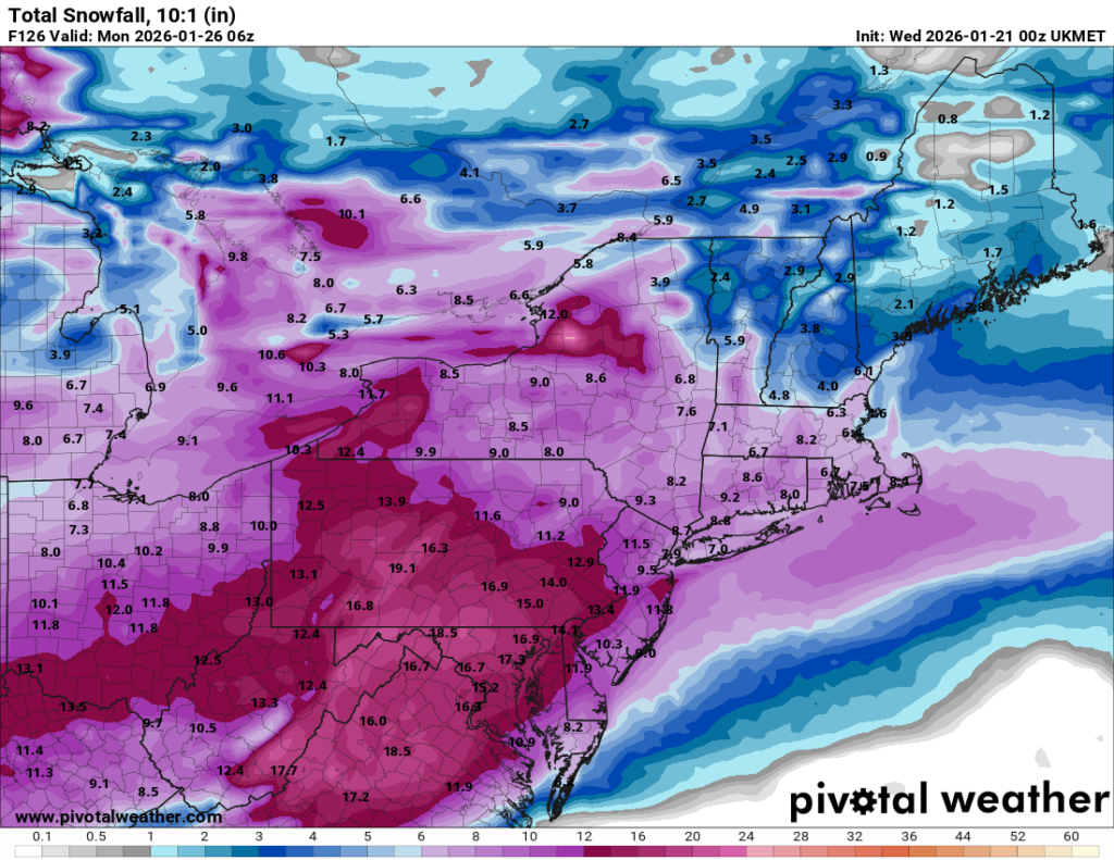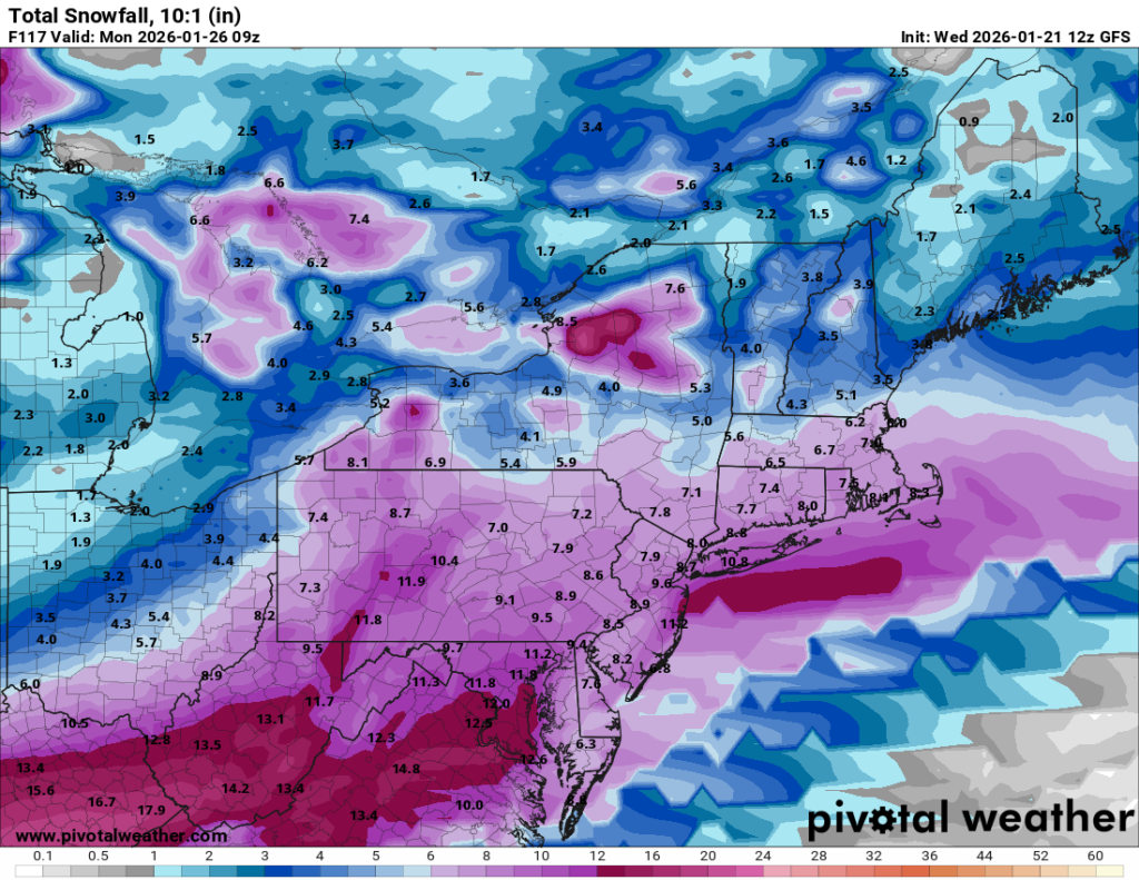 Although we’re well aware that weather models are routinely inaccurate, especially this far away from a snowstorm, we’re sharing the following images depicting total snowfall through early Monday morning to depict that models seem aligned on a potentially significant snowstorm impacting Schuylkill County.