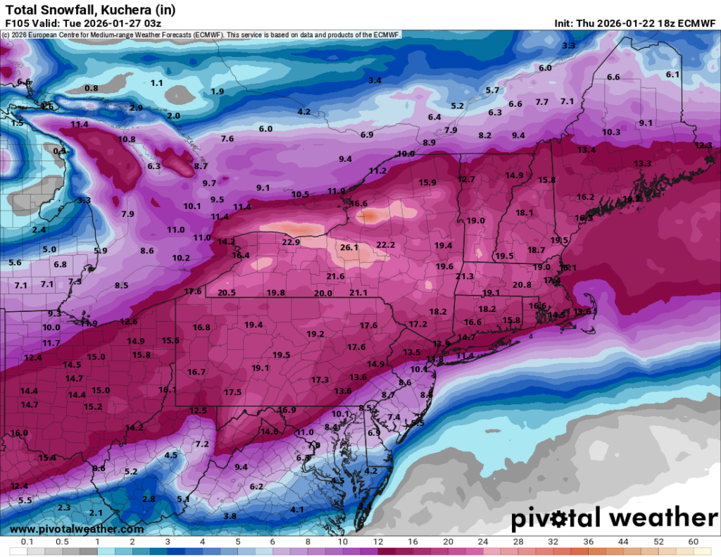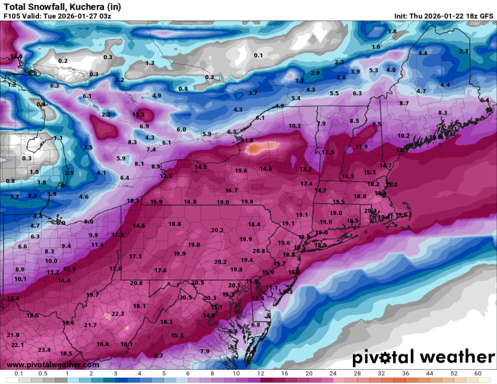 Using that ratio, you can see below that both the American and European models are showing a real whopper of a storm for Schuylkill County, with the potential for 20 inches of snow.
