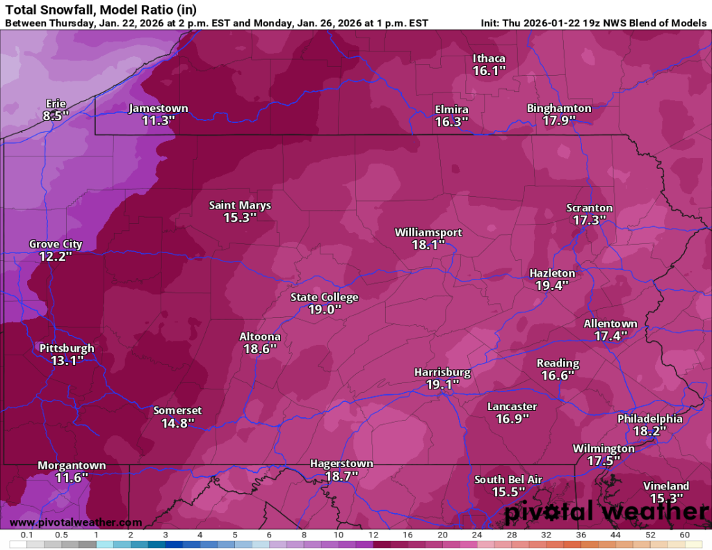 The latest National Weather Service Blend of Models has up to 19 inches of snow falling on Schuylkill County for the duration of the upcoming winter storm.