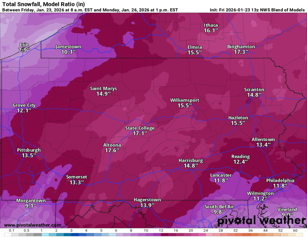 The latest National Weather Service Blend of Models forecast has Schuylkill County receiving anywhere between 13-16 inches of snow, with lowest amounts in southern Schuylkill and the highest in western Schuylkill.