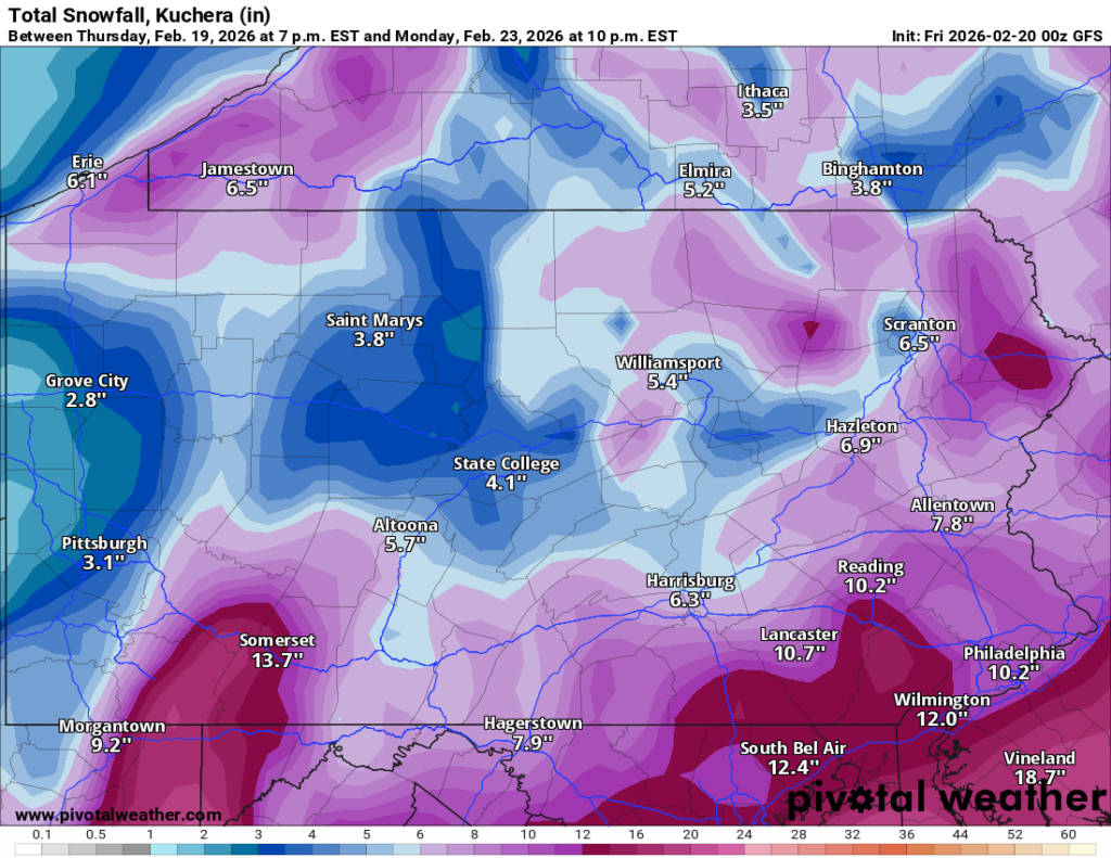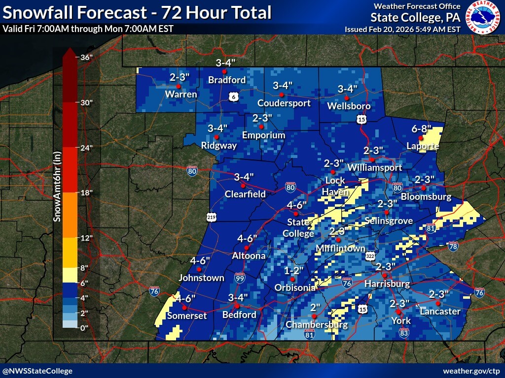 Up north, in a spot like McAdoo, NWS has 3-7 inches falling on Sunday. Mahanoy City is forecast to get between 4-8 inches.