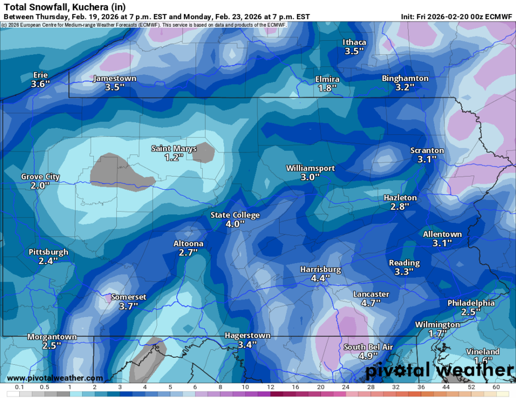 Again, not to rely too heavily on the actual snow totals but in this latest run of the European model, are looking at up to 5 inches of snow in portions of Schuylkill County, with the least in extreme northern areas.
