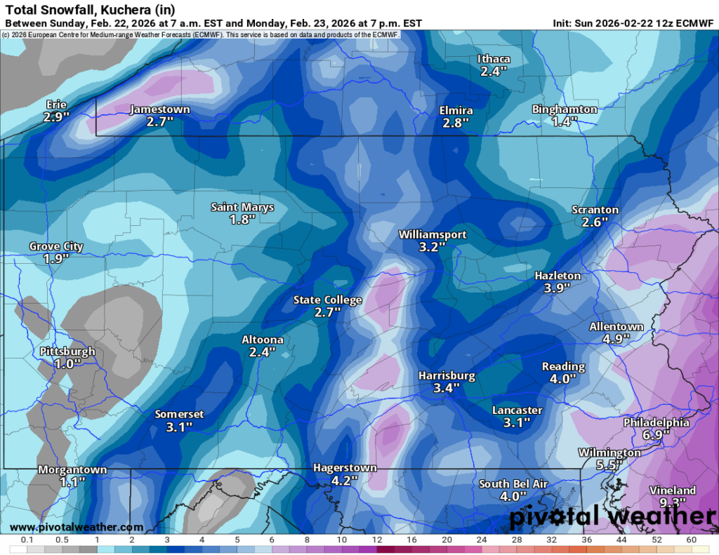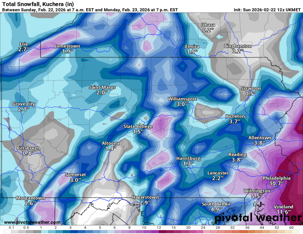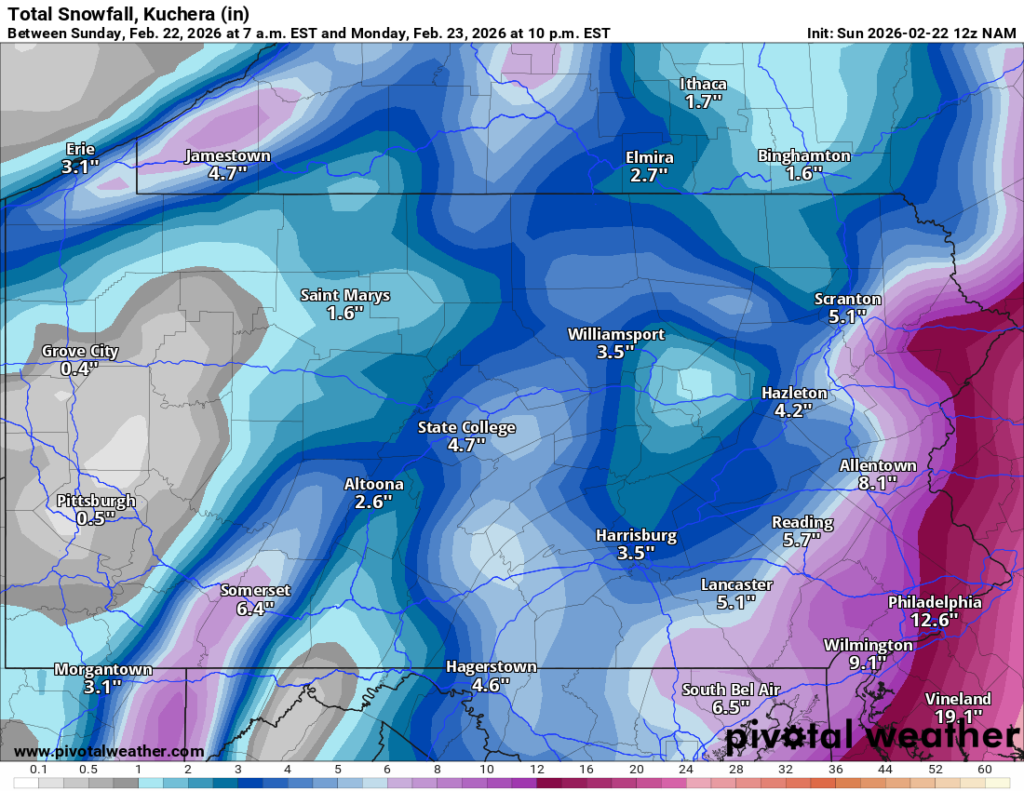 Here are the latest snow totals forecast by National Weather Service for numerous locations around Schuylkill County (as of 1:30 p.m. Sunday). If you’re looking at these totals against the model runs we’re showing here, you may want to look at the lower number in the forecast over the higher total: