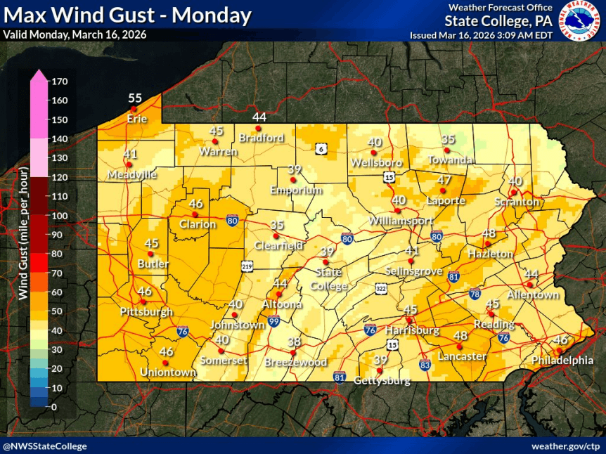 A Wind Advisory is in effect from noon until 11 p.m. today. Gusts of up to 50 mph are expected. There is currently an Enhanced risk of severe weather today in Schuylkill County.