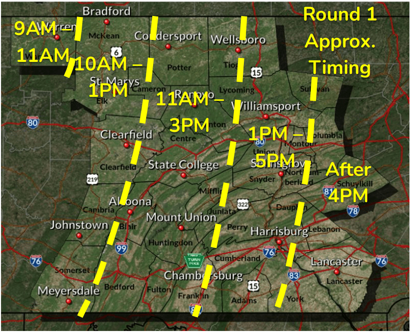 NWS expects the storms to come in two rounds today. Tornadic activity, if it happens, would be linked with the first round of storms, which is likely to impact Schuylkill County after 4 p.m. Damaging straight-line winds are also possible.