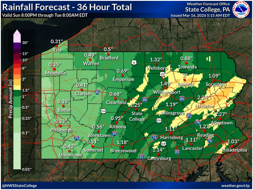 The latest information from National Weather Service indicates the severe storms are moving in ahead of a cold front. Damaging winds are the biggest threat associated with these storms. However, more than an inch of rain is also possible across all of Schuylkill County, with two inches possible at the highest elevations. Minor flooding is possible but not likely.