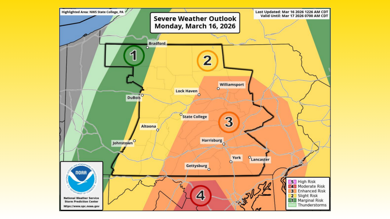 NWS expects the storms to come in two rounds today. Tornadic activity, if it happens, would be linked with the first round of storms, which is likely to impact Schuylkill County after 4 p.m. Damaging straight-line winds are also possible.