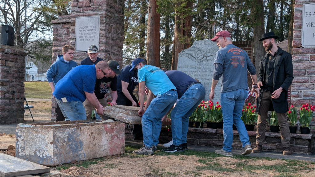 Volunteers help remove the cement lid that helped preserve the contents of a 50-year-old time capsule that was unearthed as part of Frackville’s 150th Charter Day celebration at Memorial Park on Friday. (Coal Region Canary photo)