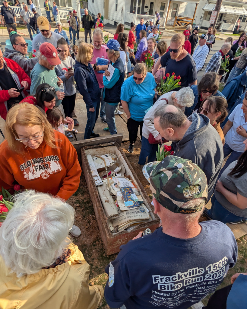 People gathered around to get a glimpse of Frackville’s past through items like license plates, numerous photos, newspapers, and other ephemera, and even a piece of Hubba-Bubba bubble gum. More items will be revealed in the days ahead as the Sesquicentennial Committee goes through it all. Photos of what’s inside are being shared on the event’s Facebook page as well as the Borough’s official page.