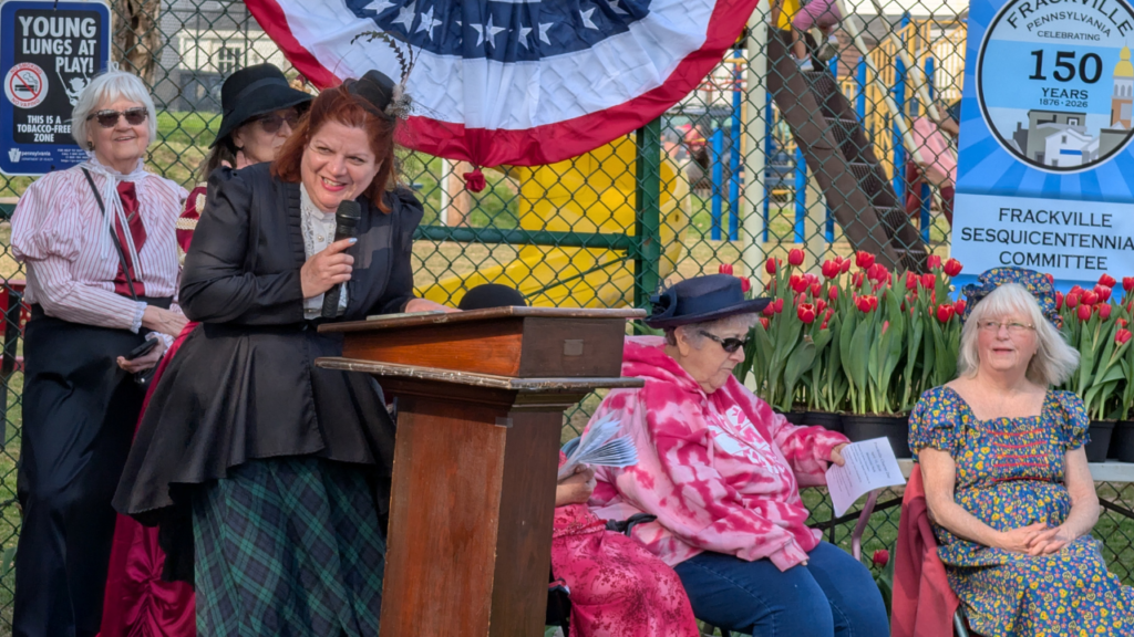 Charter Day emcee and Sesquicentennial Committee member Karen Domalakes helps launch Frackville’s 150th party on Friday. (Coal Region Canary photo)